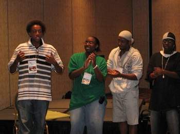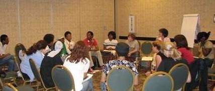 The Charter of Human Responsibilities at the USSF The Charter of Human Responsibilities was visible at the USSF in two Charter workshops and also participation of four Charter Committee representatives in multiple events throughout the four days. On Friday morning, Nina Gregg (US), Fabienne Presentey (Quebec/Canada), Cecile Sabourin (Quebec/Canada), and Maria Humphries (New Zealand/Pacific) led a workshop on Using the Charter of Human Responsibilities to address border issues, human rights and responsibilities. We introduced the Charter, described the different ways responsibility is understood in our respective countries and explained how each of us is using ‘Responsibility’ to promote reflection and action. An exercise designed by the Canadian team invited participants to trace the conditions of production and consumption of ordinary foods – where they cross borders, the border policies that have an impact on the food, its producers, consumers, and the environment – in the context of responsibility. The Pacific Charter Committee’s understanding of responsibility as “Response-ability” was an effective concept for engaging everyone in a discussion of our ‘ability to respond,’ overcoming the tendency to feel powerless when confronting national and international practices and systems. A lively discussion followed about what ‘responsibility’ means in relation to the food we eat, and how border policies would be different if they addressed responsibility for human well-being. A second workshop sponsored by the Charter was led Friday afternoon by young cultural workers from Tennessee. Youth Cultural Workers Unite! was designed by five teens who are participants in the Theatre Renaissance for Youth Ensemble (TRY), a program of The Carpetbag Theatre. TRY Ensemble members were introduced to the Charter of Human Responsibilities and the Charter of Artists Responsibilities several months earlier, and had been discussing their responsibilities as youth cultural workers. The workshop used cultural forms such as chanting, song, story telling, movement, and video to engage 30 participants in reflection on institutionalized oppression, our responsibilities, and their personal life stories. Building relationships During the USSF we initiated conversations with the Earth Charter US, with the organizers of the US Solidarity Economy Network, and with leaders of organizations working for environmental, racial, and economic justice. Beginning in August, meetings will be held in Knoxville to bring together USSF participants from the region to reflect and build on the Social Forum experience.