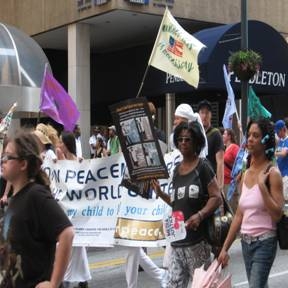 The United States Social Forum brought more than 10,000 social justice activists to Atlanta, Georgia June 27-July 1, 2007 for workshops, strategy sessions, networking, a film festival, and other cultural events. Intended to be “more than a conference, more than a networking bonanza, more than a reaction to war and repression,” the first US Social Forum was organized with a commitment to “send a message to other people’s movements around the world that there is an active movement in the US opposing US Policies at home and abroad.” (from the USSF Website ) Atlanta was chosen as the host city for the USSF because of the significance of the US South in our nation’s history of oppression and resistance: “The roots of oppression, injustice, exploitation and social control run deep in Southern soil. The US South has also cultivated determined and consistent fights for indigenous self-determination, black freedom, working class emancipation, and human liberation. Hosting the US Social Forum in the US South builds political potency for a powerful movement to challenge white supremacy, imperial domination, worldwide genocide, ecocide, and all other manifestations of global capitalism.” (from the USSF Website) The Forum began with an afternoon march through the center of Atlanta’s downtown business district. Organizations marched with banners, puppets, posters, and musical instruments.