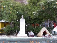 Η απέναντι πλευρά έμοιαζε να βρίσκεται σε άλλο χρόνο: ένα παρκάκι με χώμα και νεραντζιές όπου το μόνο σχετικά σύγχρονο έργο είναι ένα σιντριβάνι. Δίπλα στο άγαλμα που απεικονίζει τον δήμαρχο Αθηναίων κατά τις χρονιές 1917-1920 και 1922-1927, είχε κατασκηνώσει και ζούσε μια άστεγη νέα γυναίκα. Η ζωή της μεγαλούπολης που κινούνταν στους ρυθμούς ενός μεγαλόπνοου γεγονότος, καθώς και του εκσυγχρονισμού της, συνυπήρχε με την καθημερινότητα αυτού του περιθωριοποιημένου ανθρώπου, συγκροτώντας τις αντιθέσεις του αστικού περιβάλλοντος. |
