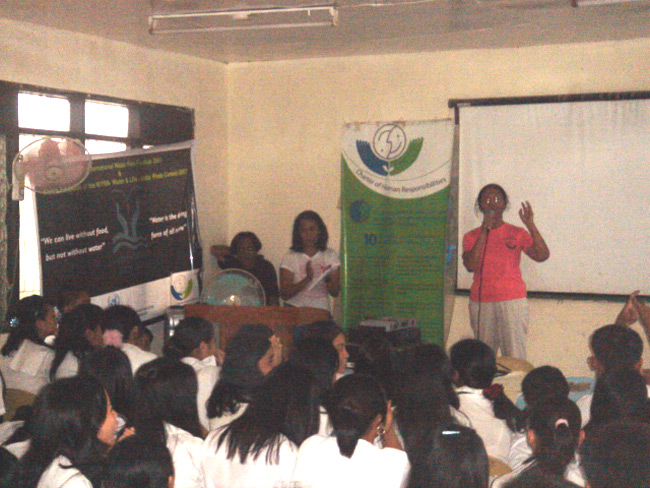 To prepare this event, Pinky Castelo-Cupino and the whole CHR Philippines team, along with Sudha Reddy and John Anugraha, from the CHR Indian Facilitation team, have visited different high schools with films on water and climate change to initiate discussions and debates on issues related to environment and the role of youth to make a difference.