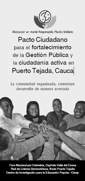 For three months (January-March 2006), a group of thirty citizens - the Democratic Leaders’ Network, including councilmen, teachers, municipal officers, cultural-affairs coordinators, and social leaders – met once a week with the support of Foro por Colombia and the CINEP to broach topics such as responsibilities, local development, public management, and citizen participation. From this, the pact was born. The Charter of Human Responsibilities process in Colombia, through its educational, social and political strategy, with the implementation of participatory methodologies and with the joint effort of Foro por Colombia, Valle Chapter, and the CINEP, developed a process first intended to build a Pact for the Requirability of Human Rights, which after in-depth thinking on responsibilities was turned into a Pact to Strengthen Public Management and Active Citizenship in Puerto Tejada, a municipality in the north of the department of Cauca, located at about 450 kilometers south of the Columbian capital, Bogotá. The process was consolidated through the following stages: first meetings were held among the Foro Foundation, the CINEP, the Puerto Tejada mayor’s office, the Puerto Tejada citizen training hub, and other parties interested in supporting the proposal; next, leaders of local social and grassroots organizations were summoned and registration and selection of participants was opened. At the same time, a curricular proposal and an advising proposal were developed so that the former would be rooted in the social reality of this municipality and its territory. In the curricular proposal, the theoretical problems were broken up into six modules: