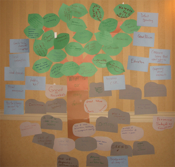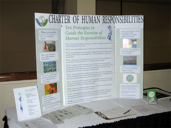 Nina Gregg del comité CRH estadounidense invitó a Chuline Carson (Carta de la Tierra, Atlanta) y a Don Huisingh representante de Green Cross a colaborar en un taller sobre el uso de la ética como fundamento de acciones responsables. Veinte participantes en el taller se familiarizaron con los compromisos éticos de la Carta de las responsabilidades humanas, la Carta de la tierra y Green Cross. Mediante el ejercicio Responsabilidad para el futuro, los asistentes al taller crearon un gráfico para representar cómo sueñan la energía en un futuro. El ejercicio lleva a los participantes a imaginar cómo quieren que sea el futuro, a identificar las barreras que limitan llegar a ese futuro deseado y a considerar los recursos disponibles para superar dichas barreras. El taller se clausuró con compromisos de acción de cada uno de los participantes.