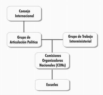 • Las Comisiones Organizadoras Nacionales deberán coordinar el proceso a escala nacional, estableciendo comunicación con el Grupo de Trabajo Interministerial. Éstas estarán invitadas a movilizar sus sistemas de enseñanza, y a organizar conferencias en las escuelas y la Conferencia Nacional, con la elección de la delegación que viajará a Brasil en 2010.