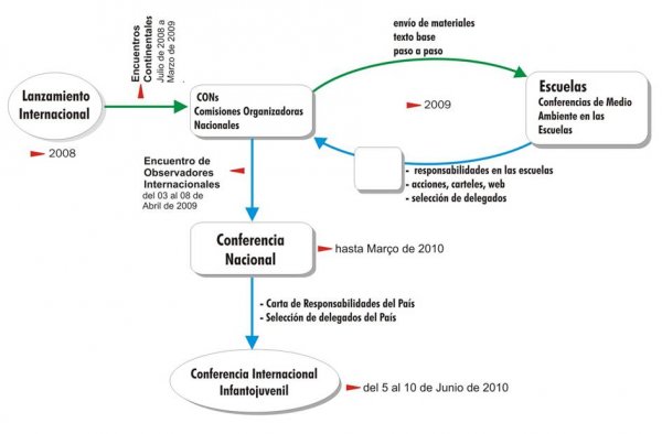 Brasil presenta, de esa manera, una tecnología socio-educacional involucrando a niños, jóvenes, educadoras y educadores de todo el mundo, en un evento multicultural donde las delegaciones provenientes de diversos países pueden debatir cuestiones socio-ambientales locales, regionales y globales, y asumir responsabilidades y acciones, formando una red mundial infantojuvenil: Cuidemos el Planeta. El proceso para llegar a la realización de la Conferencia Internacional se inicia por el estudio y el debate de los temas propuestos en las escuelas, seguidos de la realización de las Conferencias de Medio Ambiente en las Escuelas, donde se eligen los delegados que podrán participar de las Conferencias Nacionales en sus países. Luego, se realizan las Conferencias Nacionales dentro de cada país participante, con la elección de los delegados que participarán de la Conferencia Internacional y, por fin, ocurrirá el evento final de la Conferencia Internacional, en Brasil, en 2010.