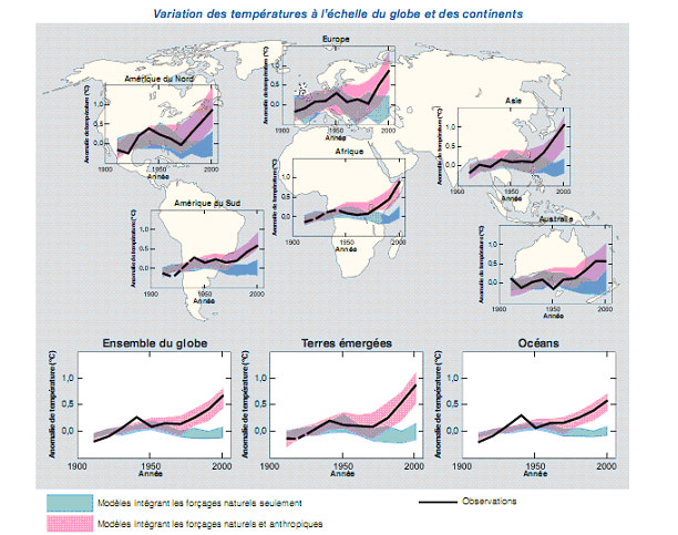 En consecuencia, el GIEC estima “con un muy alto grado de confianza, que las actividades humanas realizadas desde 1750 en adelante han tenido como efecto claro recalentar el clima y que esto es muy probablemente atribuible al aumento de las concentraciones de GEI antropogénicos” . Pues si sólo se tomaran en cuenta las causas naturales de los últimos cincuenta años (incidencia de la actividad volcánica y de las fluctuaciones de los rayos solares), el clima probablemente tendría que haberse enfriado. Sólo los modelos que toman en cuenta los forzamientos antropogénicos llegan a simular el calentamiento global observado y sus variaciones. Por el contrario, sigue siendo difícil simular e imputar la evolución de las temperaturas a escalas subcontinentales.