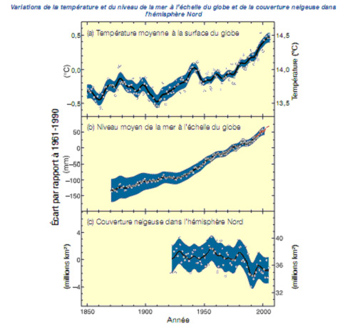 - Entre 1995 y 2007, once de los doce años figuran entre los años más cálidos desde 1850, fecha en la que comenzaron los relevamientos instrumentales de la temperatura en la superficie del planeta. El valor establecido para 1906–2005 asciende a +0,74°C en promedio. Es muy probable que las temperaturas medias de la segunda mitad del siglo XX en el hemisferio Norte hayan sido más elevadas que las de cualquier otro período de igual duración en el transcurso de los últimos 500 años, y es probable que hayan sido las más altas de los últimos 1300 años por lo menos.