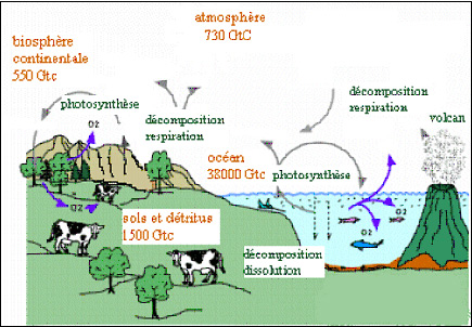 El ciclo terrestre y marino del carbono se efectúa a través de tres fenómenos: la fotosíntesis [9], la respiración y la descomposición.
