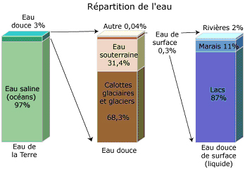El 97% de la cantidad de agua presente en la Tierra se encuentra en los mares y océanos (agua salada), el 3% restante es agua dulce. De ese 3%, sólo el 0,3% está disponible como aguas superficiales. En parte es lo que queda para el consumo humano y animal.